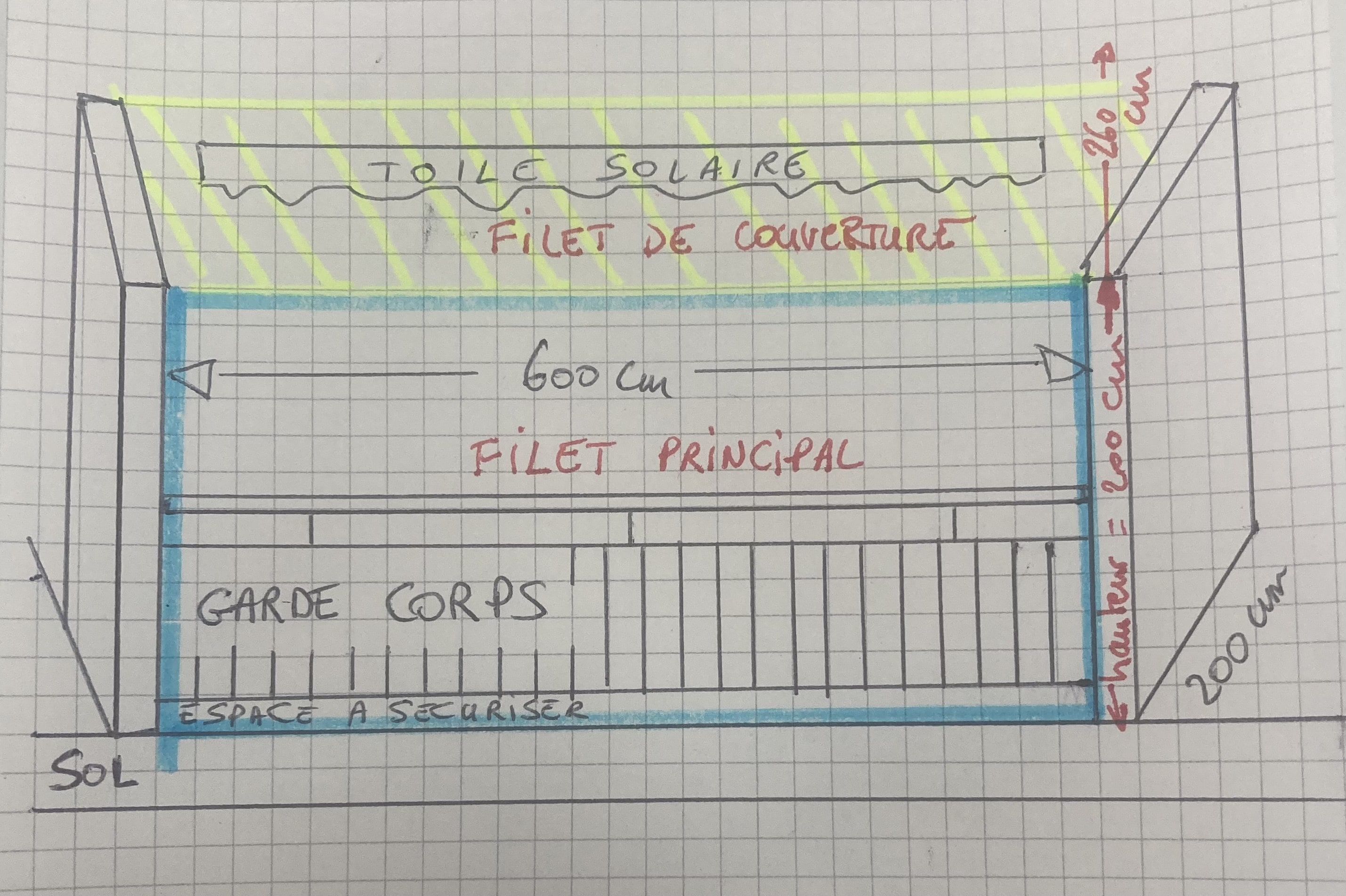 2. les éléments sur lesquels nous pouvons fixer le filet: murs, sol, plafond, garde-corps et les matériaux en présence. exemple: mur en brique, garde-corps en acier...